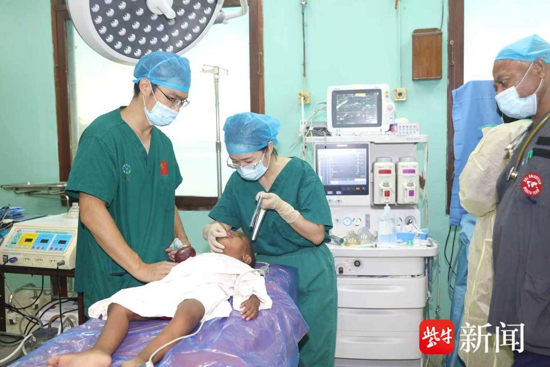 2025年10月23日,在坦桑尼亚桑给巴尔纳兹莫加医院明亮的手术室里,一场精细的咽喉手术正在进行。中国(江苏)第35批援桑给巴尔医疗队队员、连云港市第一人民医院耳鼻咽喉头颈外科副主任医师李利和麻醉科副主任医师栾恒飞,正密切配合,为一名患儿进行喉部检查和手术……