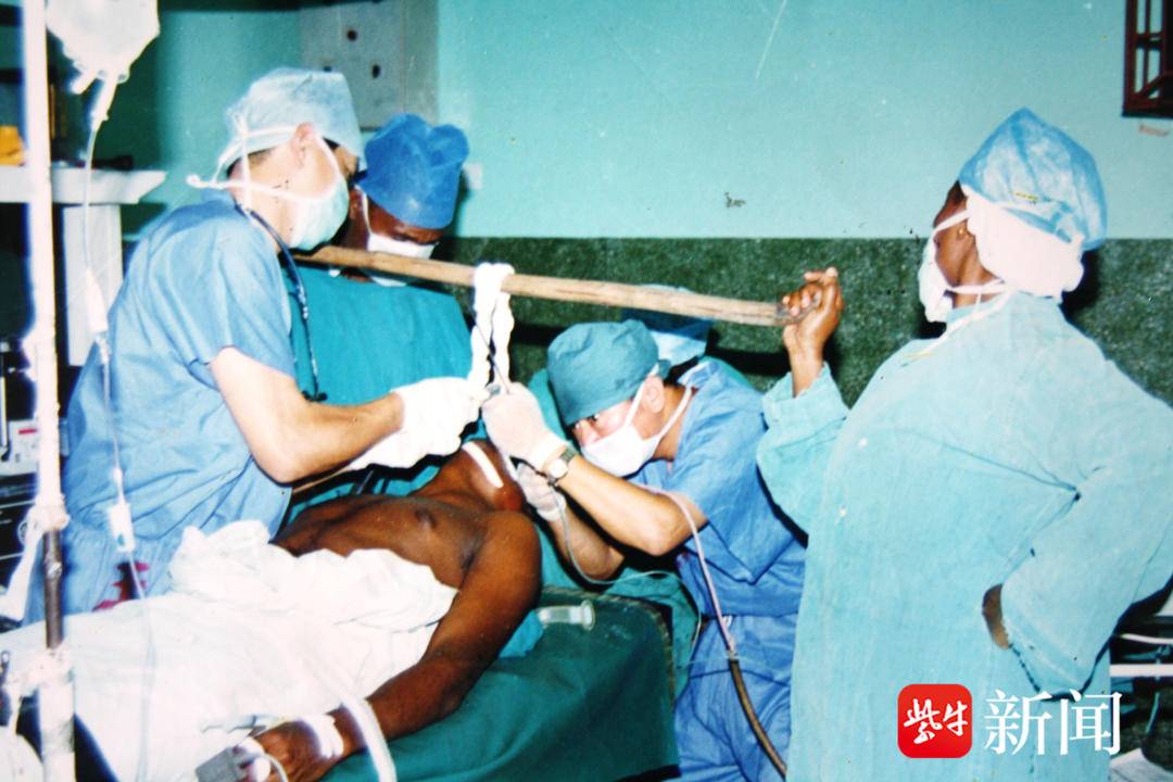 时间回溯到2000年1月1日。在桑给巴尔首都医院,由连云港市第一人民医院派出的第18期援非医疗队员——耳鼻喉科医生贾文波和麻醉科医生赵志斌,正为一名喉肿瘤患者施行手术。当地医疗设施极其匮乏,连最基本的医疗支撑器械都无法保障。照片记录下那个震撼瞬间:手术台旁,当地两位医生肩扛着两根粗糙的木棍,勉强支撑起简易喉镜的框架。这张照片,成为了中国援非医疗早期筚路蓝缕、艰苦奋斗的历史见证。